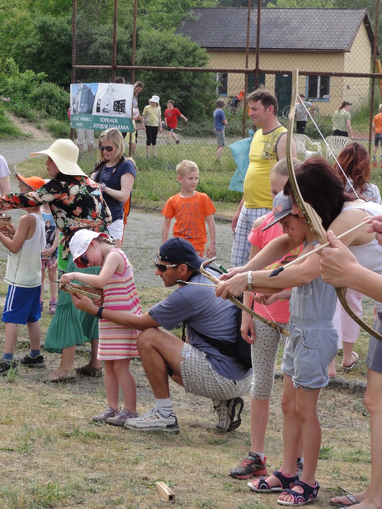 Počasí nás trochu potrápilo. Nejdříve krásně svítilo sluníčko, ale postupně se obloha zatáhla a udělalo se velké dusno. Soutěžení se tak stalo trochu náročnější a například při střílení z luku a kuše se někteří při míření na terč "zapotili", ale všichni to nakonec zvládli výborně, i ti nejmenší. V další disciplíně se pro změnu jednalo o střílení z praku na cíl nebo se mohly děti projít na dřevených chůdách či poměřit svoje síly v souboji jeden proti jednomu. Svoji vytrvalost si děti prověřily, když cválaly na dřevěném koníkovi po běžeckém oválu. Bystrost si otestovaly při skládání puzzle hradu a při hledání správné cesty bludištěm, naštěstí jenom na papíře. Sotva děti splnily všechny úkoly, počasí se zkazilo a začalo poprchávat. Beřkovští ze Šebířova stačili ještě provést ukázku funkčnosti svých zbraní a povědět pár historických zajímavostí. Nechyběl ani pořádný výštřel, při kterém si děti zacpávaly uši. Po krátké středověké scénce a prezentaci si mohli ještě dětští návštěvníci na památku vyrazit minci. A pak už konečně došlo na rozdávání odměn za všechnu tu píli a vynaložené úsilí při absolvování jedenácti "rytířských" disciplín. Déšť nás naštěstí zastihl až na samém závěru pozdního odpoledne, ale bylo se kde schovat.