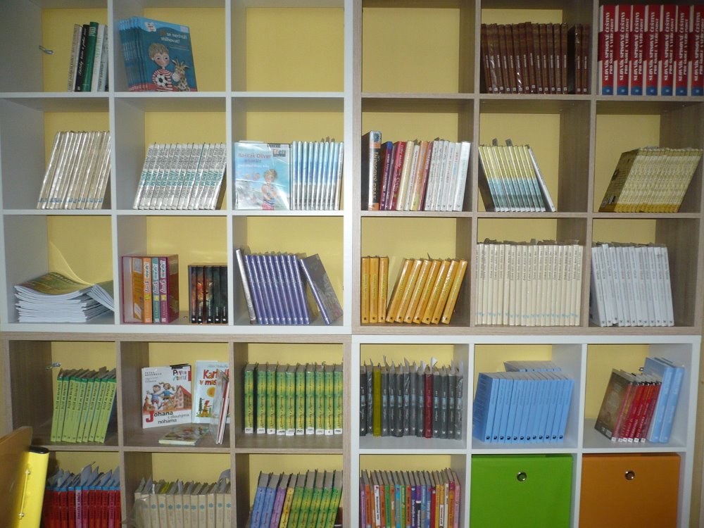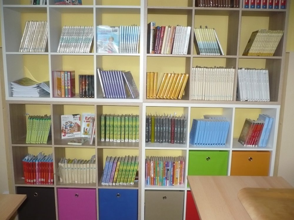 Policový systém do knihovny slouží pro snadnější orientaci při výběru knih. Snahou je, aby se děti i menšího vzrůstu lépe dostaly ke knihám a snadněji se orientovaly díky většímu dělení prostoru knihovny. Podařilo se zakoupit díky této dotaci 4 kusy knihovny a 8 barevných úložných boxů pro snadnější orientaci dětí v části učebny sloužící jako knihovna.